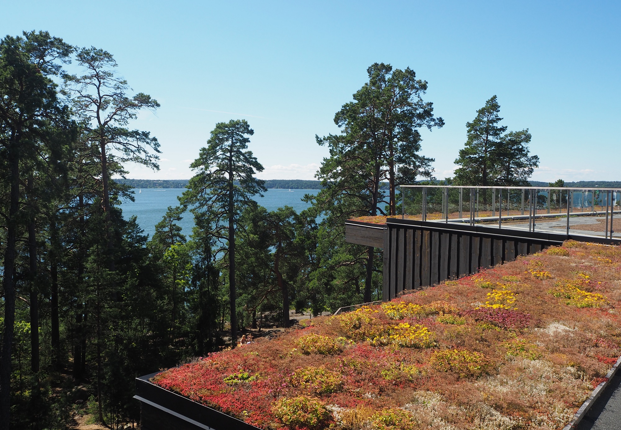 Weiter durch Skurusundet, eine sehr enge Stelle bei Nacka. An einem solch schönen Samstag Nachmittag wie heute reiht sich hier Boot an Boot, und fast alle halten sich an das Tempolimit. Wie machen Mittagspause bei „Artipelag“, einem einsam und naturnah gelegenen Museum im Südosten der Stadt. Gestiftet wurde es vom Erfinder des „Babybjörn“. Wir genießen das mitgebrachte Picknick (Kartoffelsalat und Würstchen), schauen vom Dach des Gebäudes und erkunden die Umgebung.