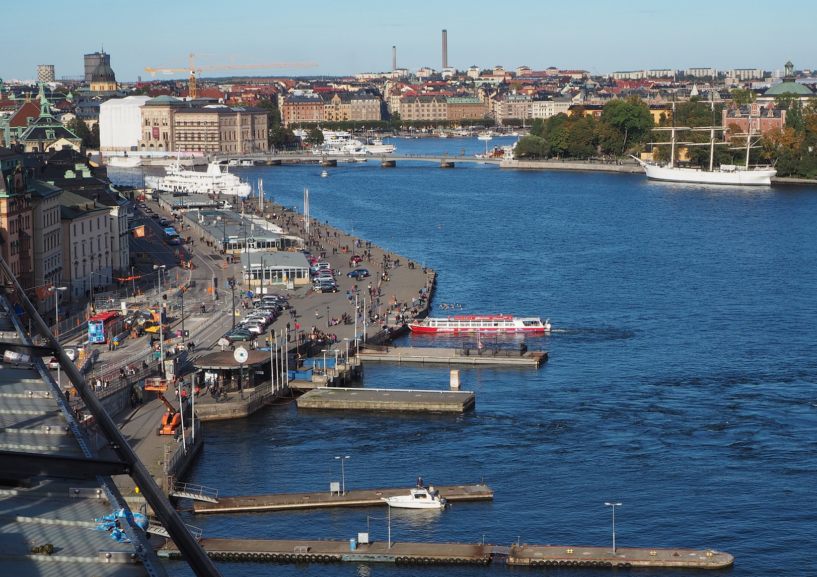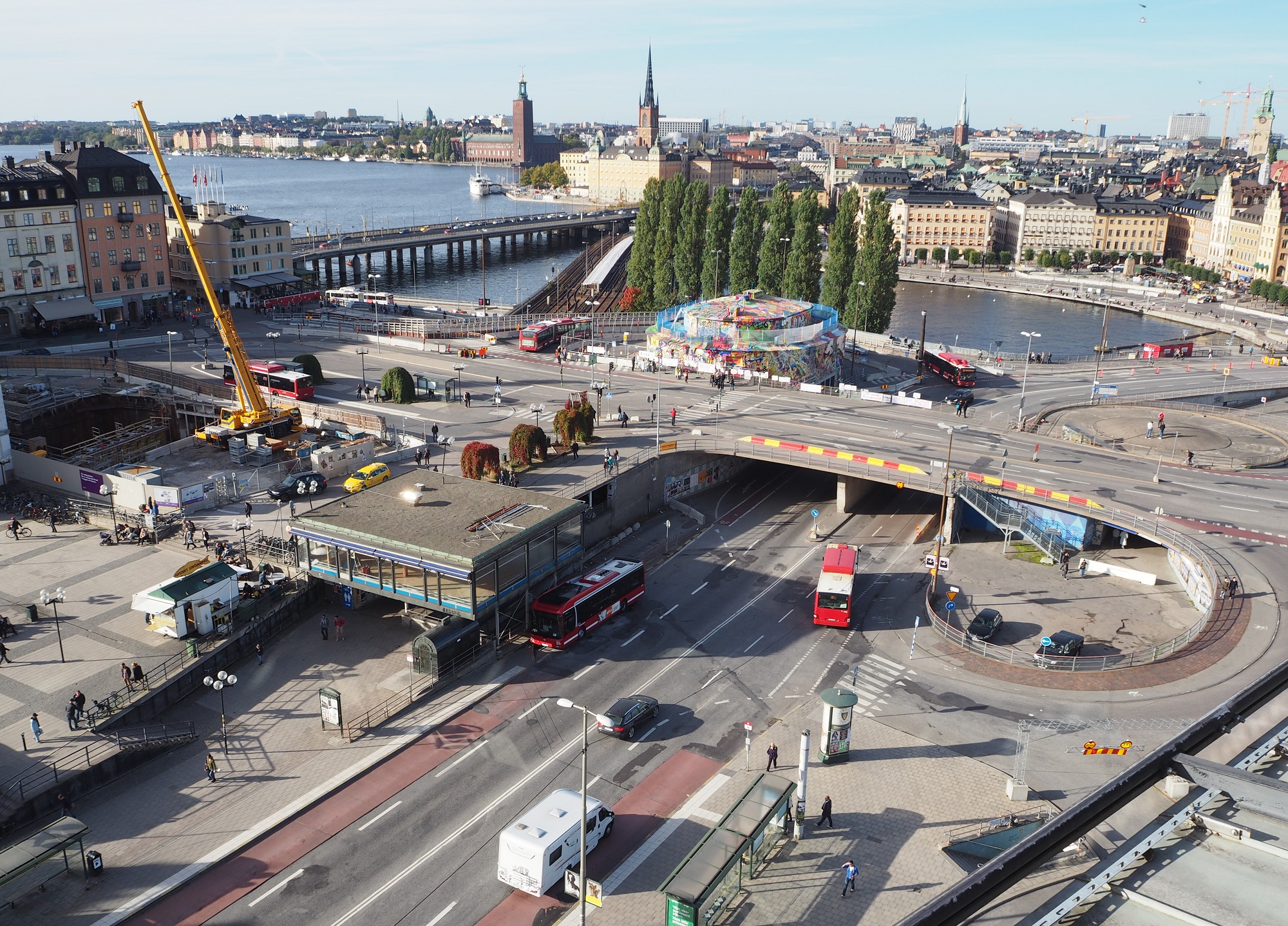 Auf Langholmen findet sich eine nette kleine Imbissbude kurz vor dem Übergang nach Södermalm. Es geht am Wasser (Söder Mälarstrand) entlang weiter Richtung Slussen. Dort können wir die Räder zunächst mal abstellen. Wir ersteigen die Aussichtsplattform Katarina Gångbro und sehen den ganzen Bereich Slussen – in all seiner „Schönheit“. Hier soll innerhalb der nächste zehn Jahre alles umgebaut werden, man kann gespannt sein.