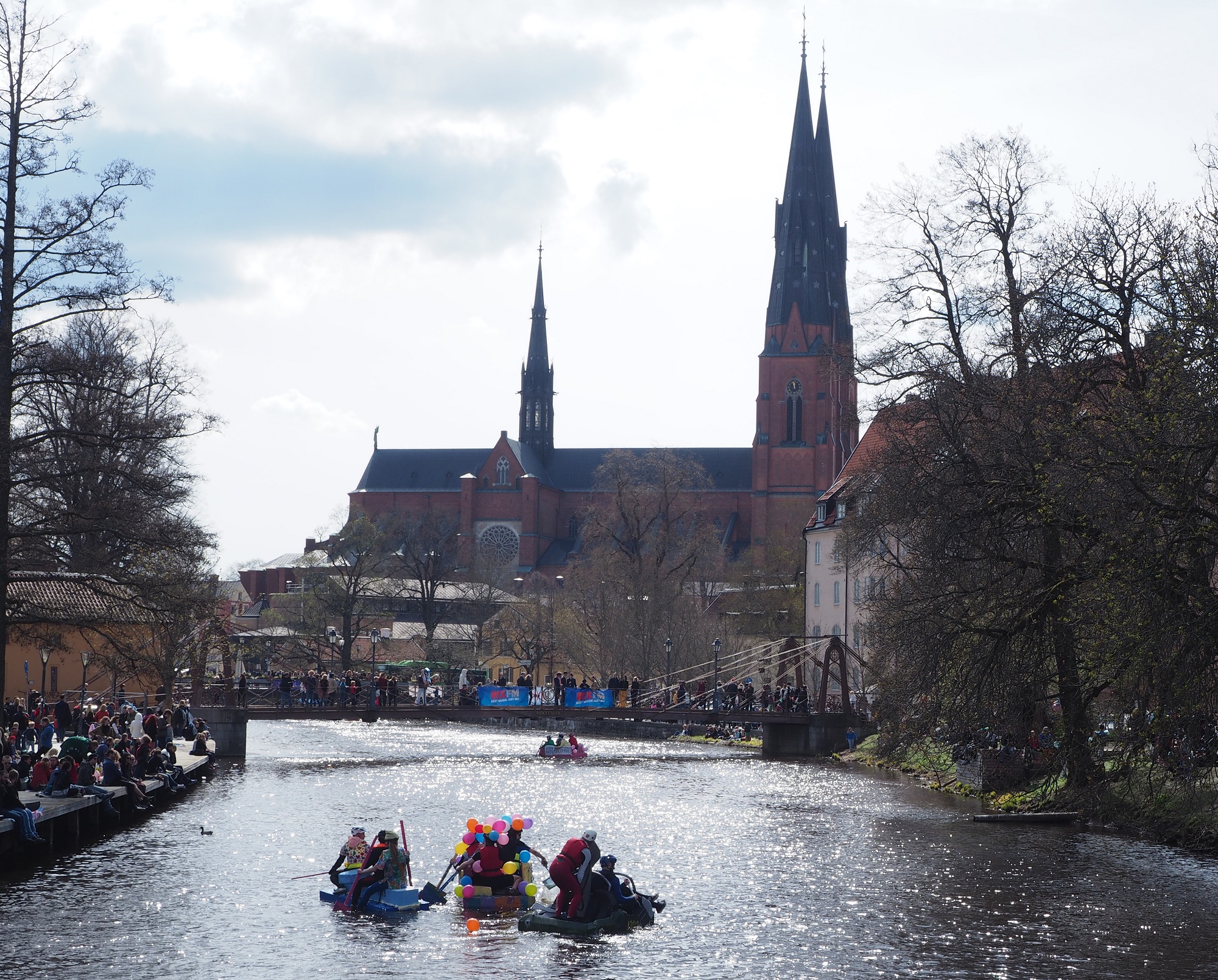 In der Studentenstadt Uppsala finden 30. April allerlei lustige studentische Spielchen statt. So stürzen sich viele in abenteuerlichen Styroporbooten in den Fluss und lassen sich vor tausenden Zuschauern das Wehr hinuntertreiben.