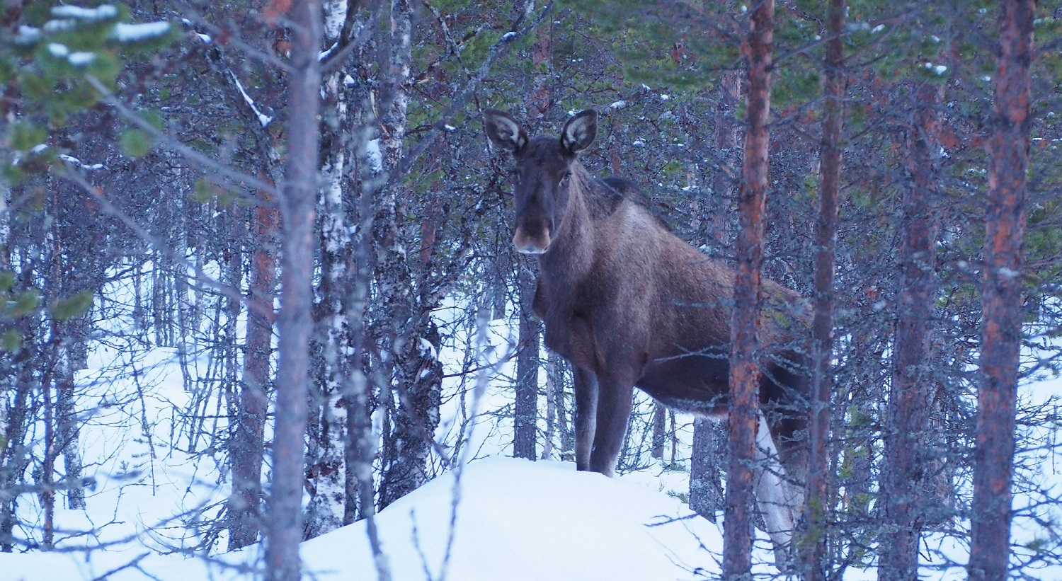 Auf der Heimfahrt am dritten Abend passiert schließlich, was wir insgeheim gehofft hatten: direkt an der Straße steht ein Elch am Waldrand. Als wir anhalten, entdecken wir noch einen zweiten. Die Elche und wir schauen uns minutenlang gegenseitig an. Bei uns war die Aufregung und Freude offensichtlich etwas größer. Irgendwann wird es den beiden etwas zu blöd uns sie stapfen weiter durch den tiefen Schnee und suchen nach Ästen zum Abknabbern. Ein paar hundert Meter weiter stehen auf der anderen Straßenseite tatsächlich nochmal zwei Elche und lassen sich in Ruhe von fotografieren. An den beiden darauffolgenden Abenden sehen wir in der gleichen Gegend nochmals jeweils zwei Elche. Ob es jeweils die gleichen waren wie an den Vortagen, lässt sich schwer sagen. Wir haben also entweder vier, sechs oder acht freilaufende Elche gesehen. Ein „echtes schwedisches Erlebnis“!