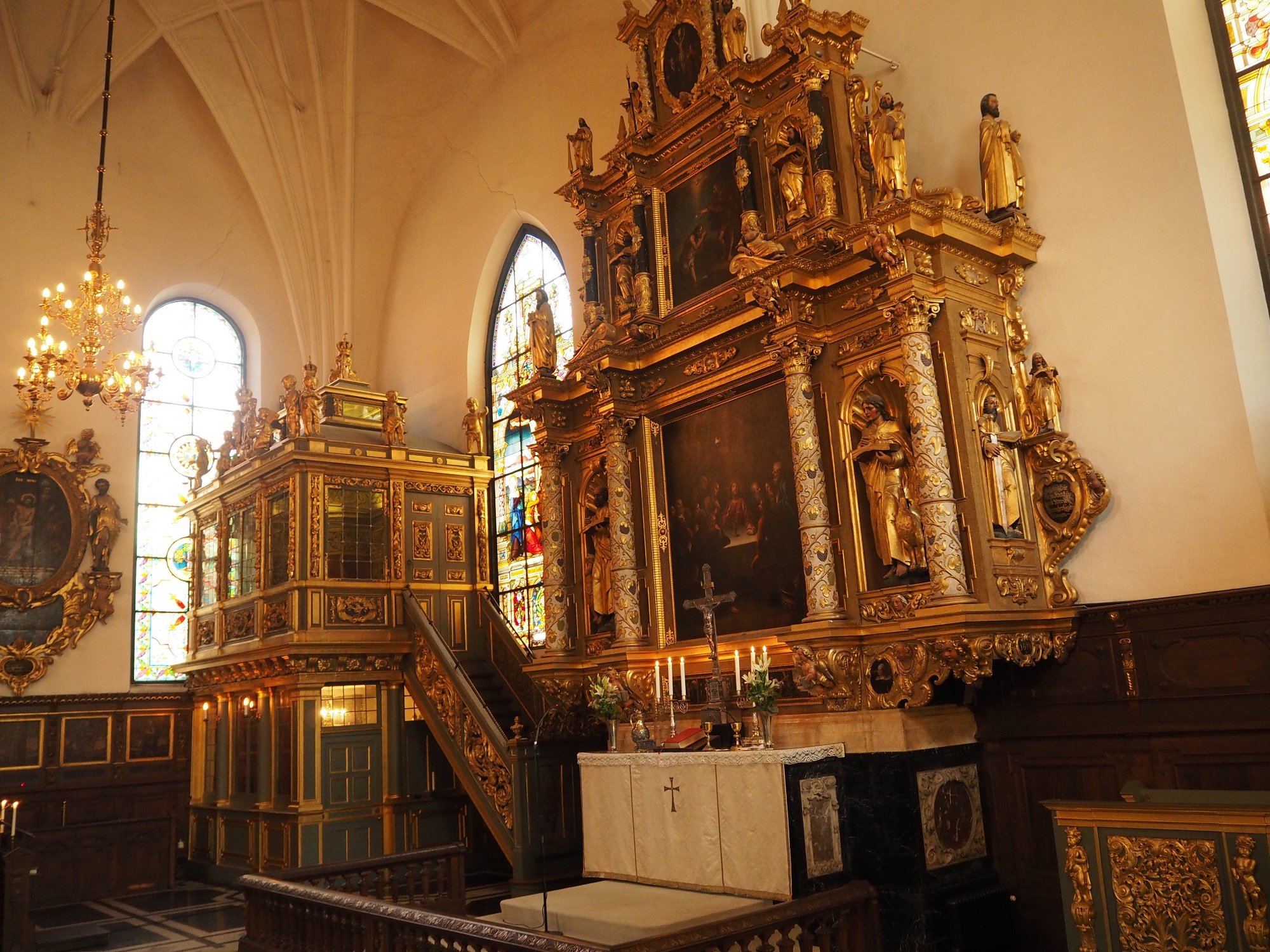 Am ersten Sonntag unseres Aufenthaltes in Schweden besuchen wir den Gottesdienst in der deutschen Kirche. Sie ist eine der ältesten Kirchen Stockholms und sieht für unsere Augen eher etwas katholisch aus mit dem vielen Gold an Altar und Orgel. Der Gast-Prediger, früher Vikar an der Kirche und jetzt als Tourist in der Stadt, begrüßt die Einheimischen und die Touristen. Wir zählen uns jetzt stolz zur ersten Gruppe! An Weihnachten wollen wir hier die Königen und die Kronprinzessin treffen!