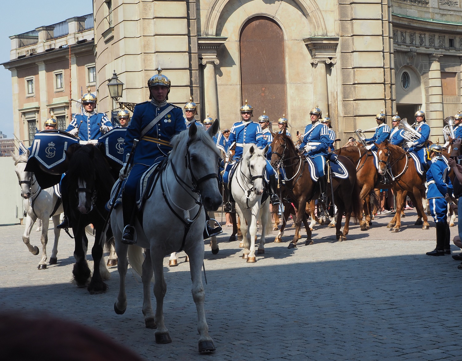 Dann zieht es uns Richtung Hafen: Wir wollen eine Schiffsrundfahrt machen und Stockholm vom Wasser aus kennen lernen. Unterwegs bekommen wir gerade noch das Ende der königlichen Wachablösung vor dem Schloss mit. Von weitem klingt die Blasmusik sehr gut, das müssen wir uns in Kürze mal vollständig und aus der Nähe ansehen!